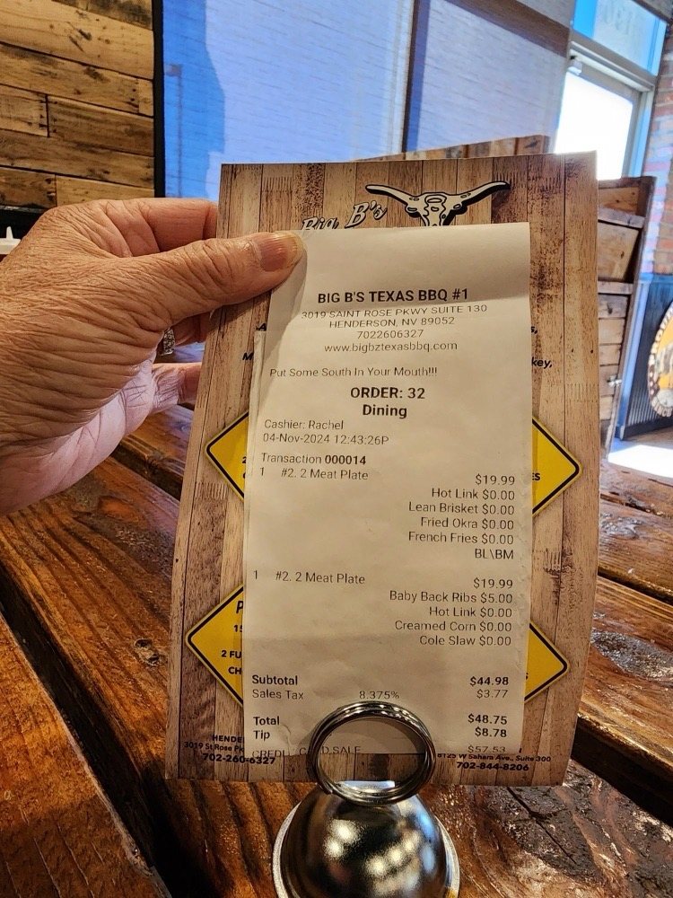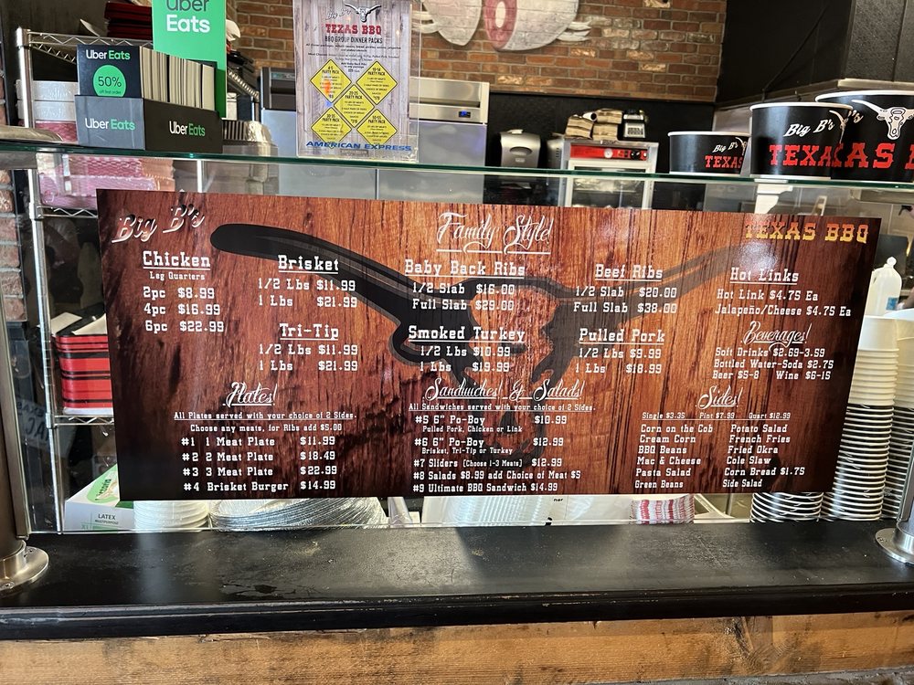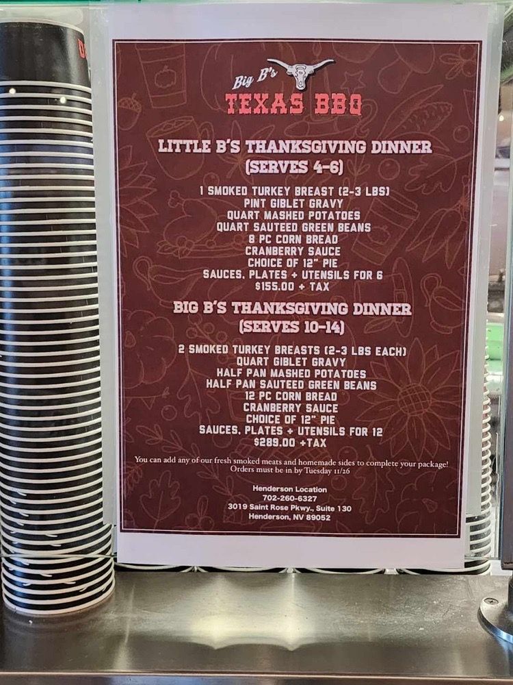Big B's Texas BBQ in Henderson, NV, offers a diverse menu of salads, sandwiches, and barbeque dishes. Customers rave about the generous portions and flavorful meats, such as the moist cut brisket and tender tri tip. The sides, including fried okra and mac & cheese, are highly recommended. The staff is friendly and accommodating, providing excellent service. The atmosphere is casual and Texas-themed, perfect for a laid-back dining experience. With options for takeout, delivery, and catering, Big B's caters to a variety of needs. The extensive list of amenities, including free Wi-Fi, outdoor seating, and dog-friendly areas, make it a versatile choice for families, groups, and solo diners alike. For a taste of authentic Texas BBQ in a welcoming setting, Big B's Texas BBQ is a must-try spot.
