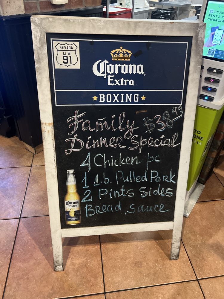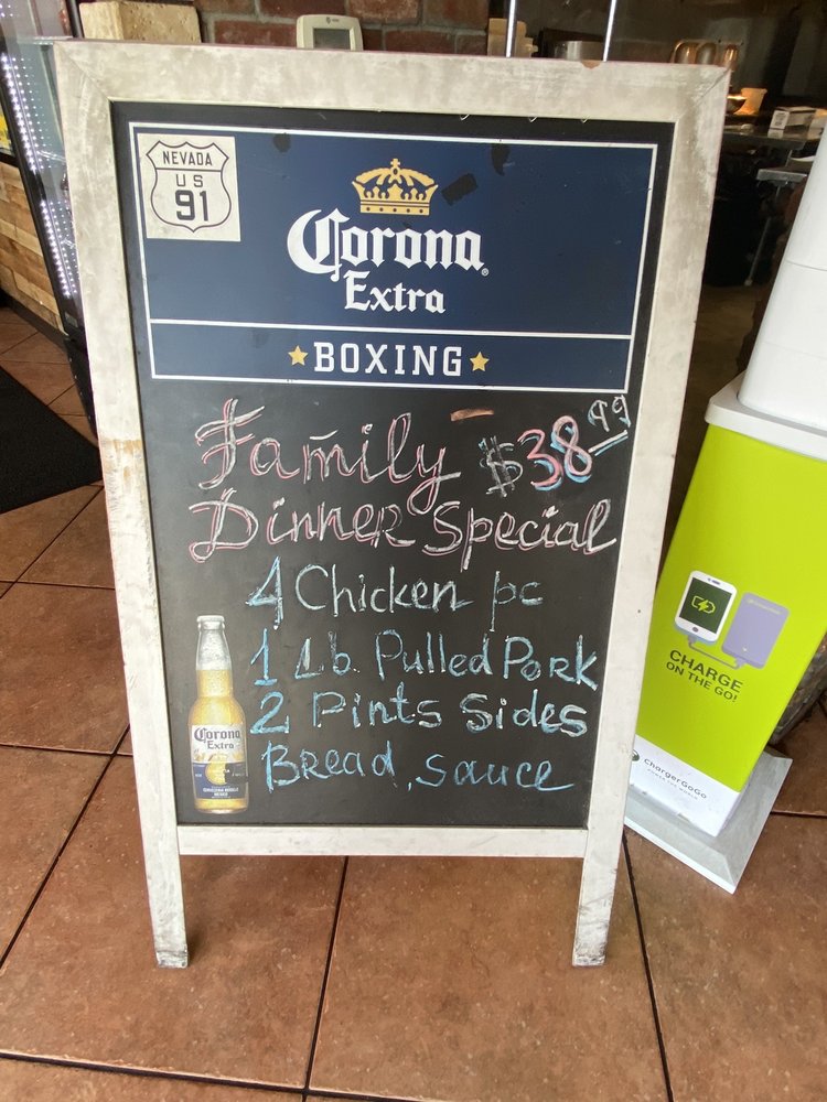 Includes 1 lb pulled pork, 4 chicken leg quarters, your choice of 2 pint size sides, bread (on request) and sauces.